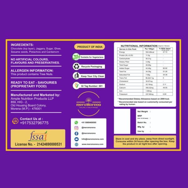 Ingredients: Chocolate (top layer), Sesame Seeds, Jaggery, Sugar, Pistachios, Almonds, Ghee, and Cardamom