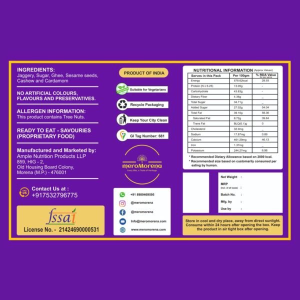 GI Tag : Morena Gajak, Class 30, under GI no. 681, As of the date : 31.01.2023
